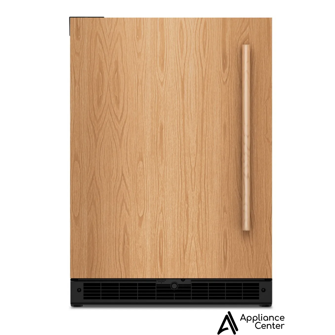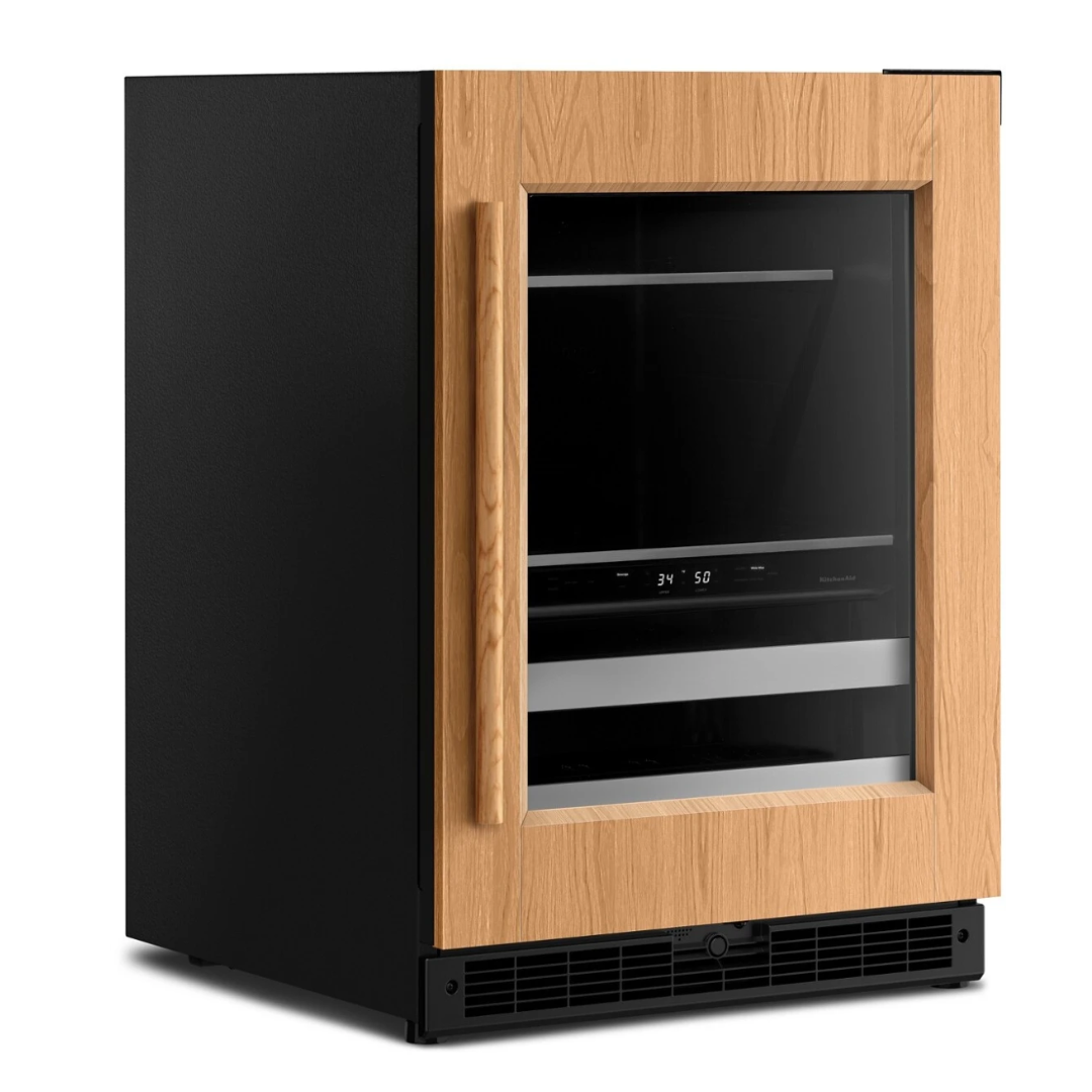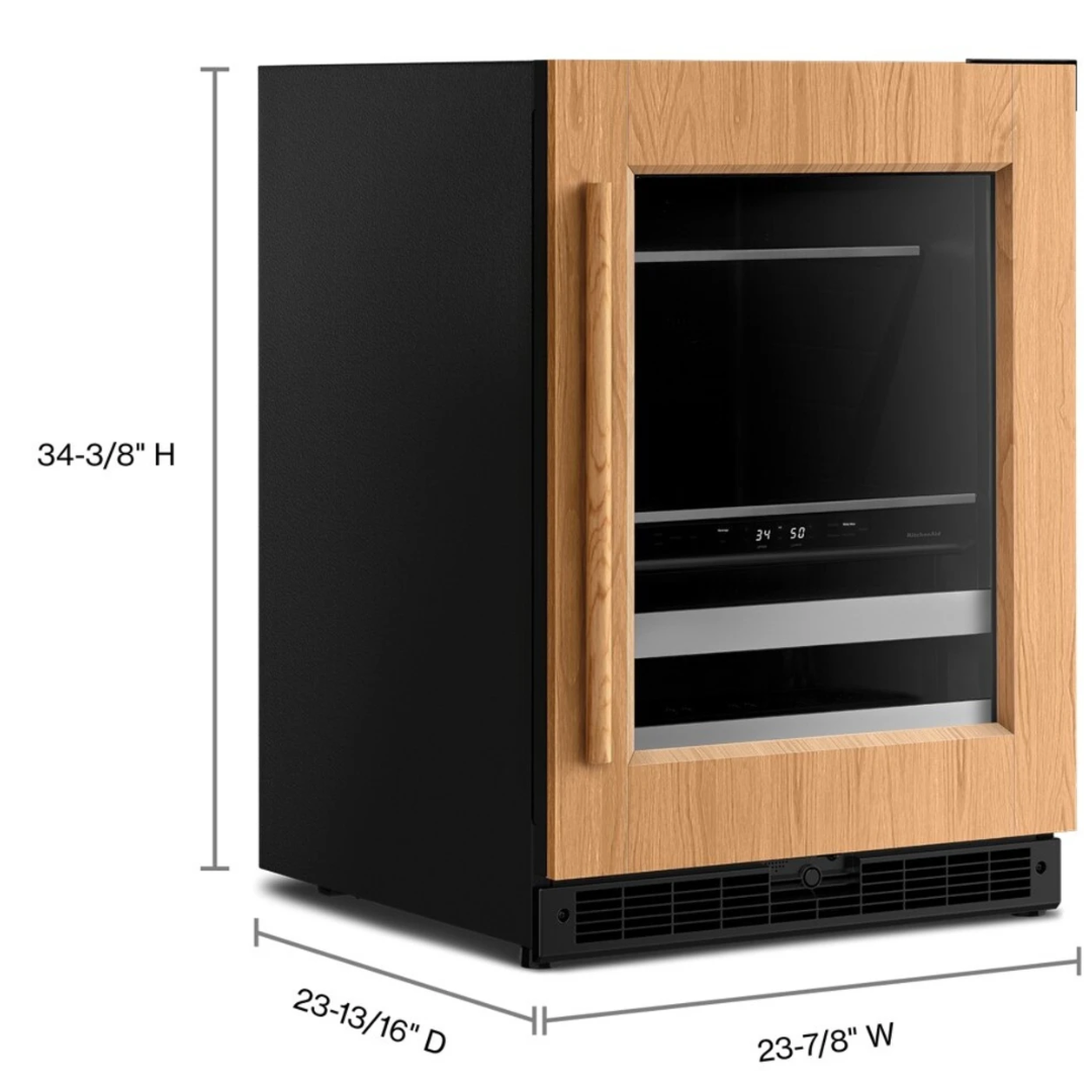 Centro de bebidas de 24 pulgadas empotrado bajo encimera con dos zonas y capacidad para 14 botellas de vino, estantes frontales de madera de extensión completa SatinGlide®, puerta de vidrio térmico con protección UV, controles táctiles retroiluminados, modo Sabbath y certificación Star-K: listo para panelar – bisagra izquierda