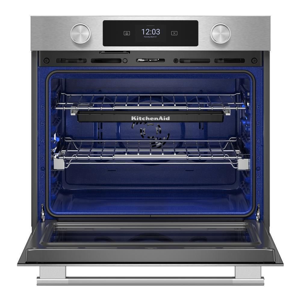 Explora nuevas recetas con consejos integrados en este horno de pared inteligente KitchenAid, que incluye nuestros modos de cocción asistida y convección real Even-Heat™ más precisos. La pantalla táctil LED y las perillas retroiluminadas permiten una navegación táctil. Las perillas retroiluminadas también ofrecen una guía visual durante el proceso de cocción: se iluminan cuando el horno se está precalentando y parpadean al finalizar la cocción.