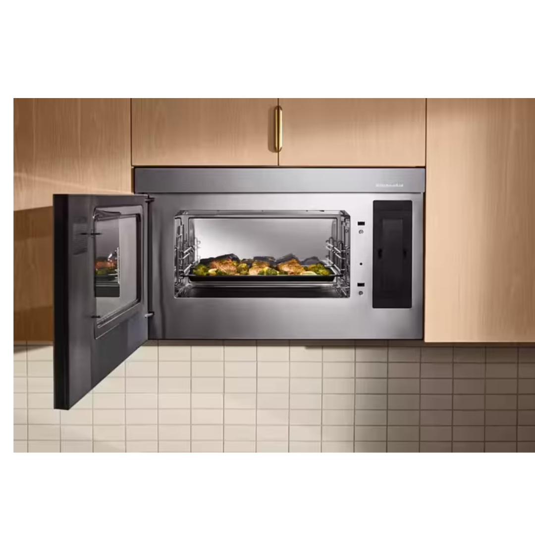 Este horno multifunción sobre la estufa KitchenAid® combina la versatilidad de una freidora de aire, un horno tostador, un horno de convección, un deshidratador, una fermentadora de pan, un microondas y una campana extractora, todo en un solo electrodoméstico compacto, diseñado para una instalación al ras en un hueco estándar de 32 cm. Los modos de sensor infrarrojo ofrecen asistencia intuitiva para derretir chocolate suavemente, descongelar pollo congelado sin quemar los bordes y evitar salpicaduras.