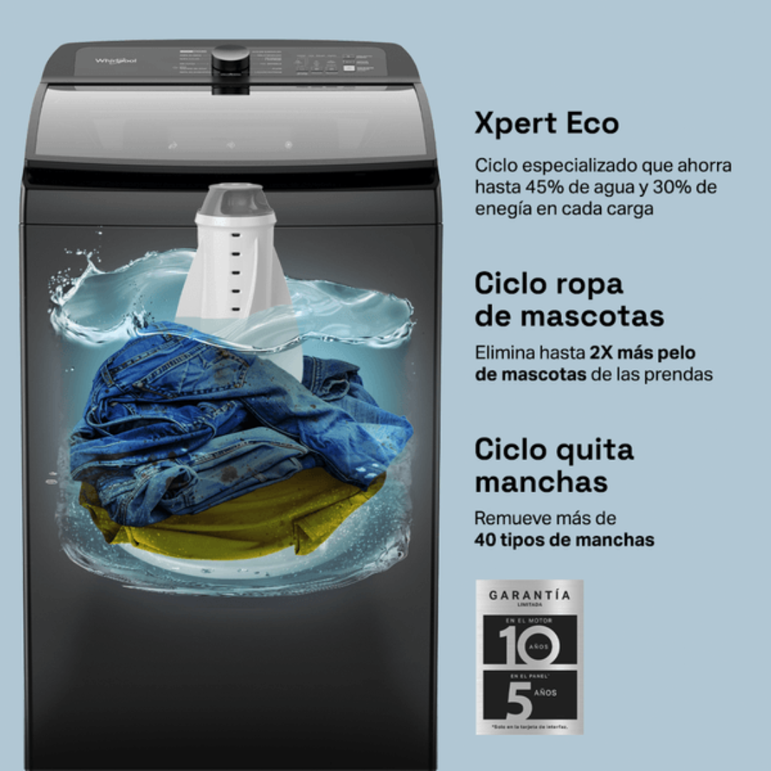 Agitador Whirlpool de alta eficiencia: mueve la ropa en múltiples direcciones para remover la suciedad más difícil sin dañar las fibras.