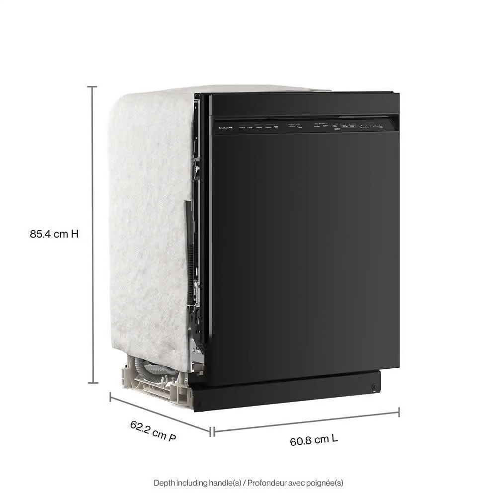 Disfruta de lavado eficiente y silencioso con el lavavajillas empotrado KitchenAid KDFS224SBL de 24 pulgadas y capacidad para 13 servicios. Con más de 30 boquillas de lavado en 3 brazos, ofrece una limpieza profunda en todos los niveles, eliminando la necesidad de prelavar los platos.
