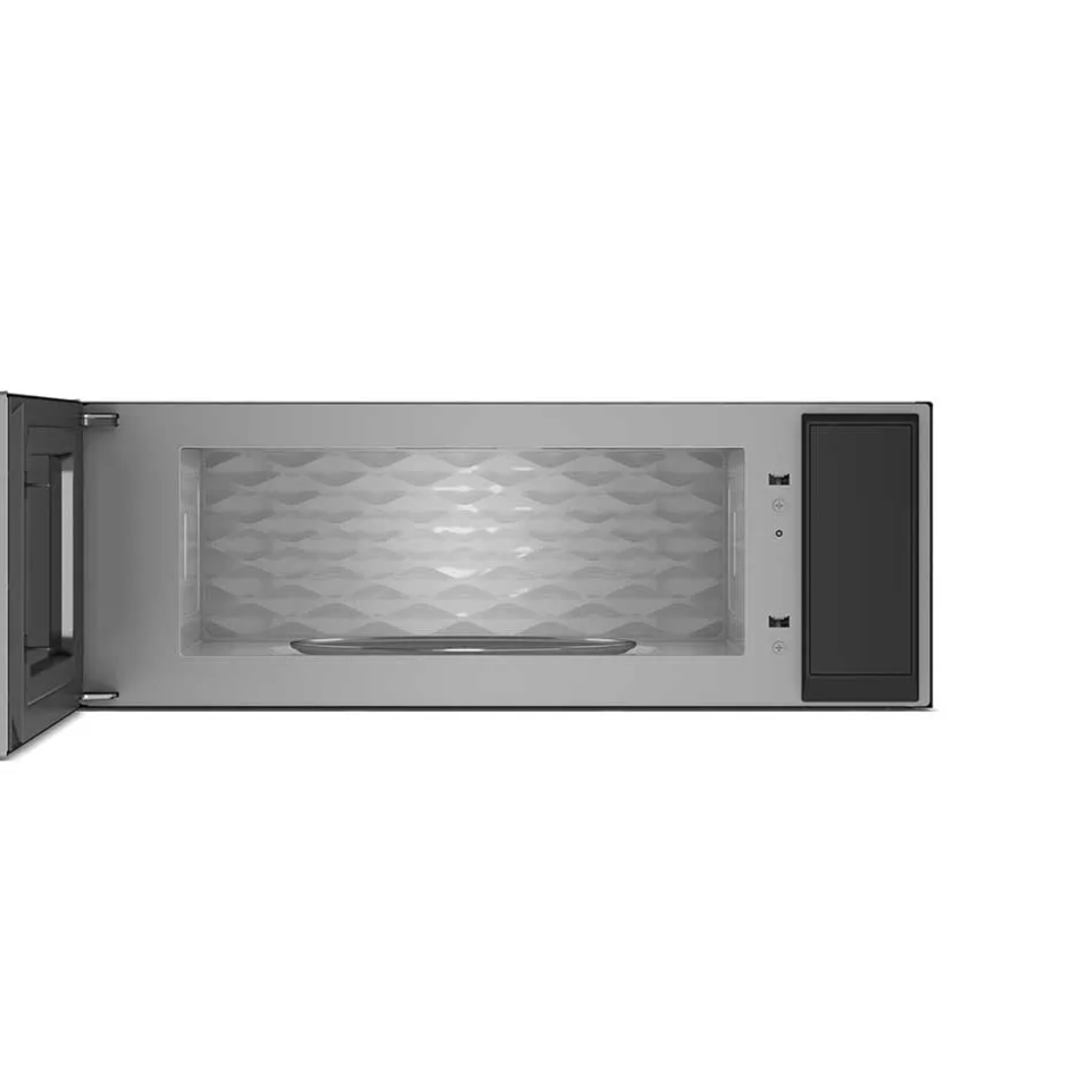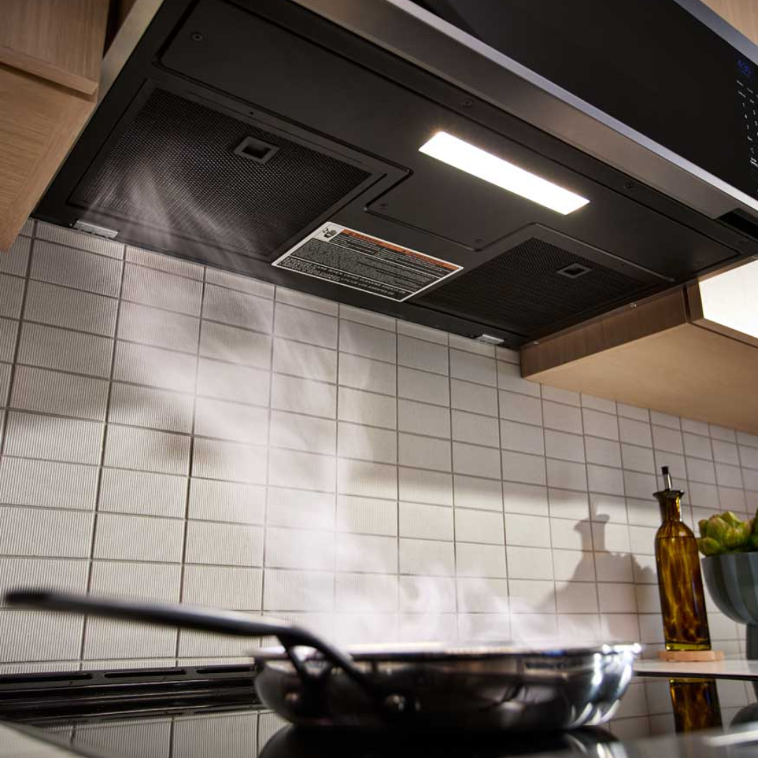 Campana extractora de microondas inteligente de perfil bajo con ventilación de doble ventilador Disfrute de recetas más atrevidas en la cocina con una elegante combinación de microondas y campana extractora, diseñada para superar las expectativas. El sistema de ventilación de doble ventilador utiliza un motor de 600 CFM para ayudar a eliminar el humo y la grasa del aire. Las funciones inteligentes le permiten mantener el control de la cocina con comandos de voz manos libres para el ventilador y luces LED multicolor. Su capacidad de 1.1 pies cúbicos ofrece un interior espacioso que alberga cómodamente una variedad de platos grandes, con suficiente altura para una taza alta y ancho para una cacerola grande.