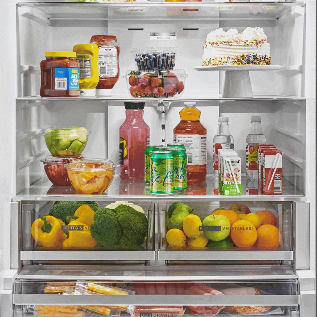 Con enfriamiento de cobertura total, las ventilaciones de flujo múltiple dirigen aire fresco y frío por todo el refrigerador para ayudar a mantener una temperatura uniforme en cada estante.