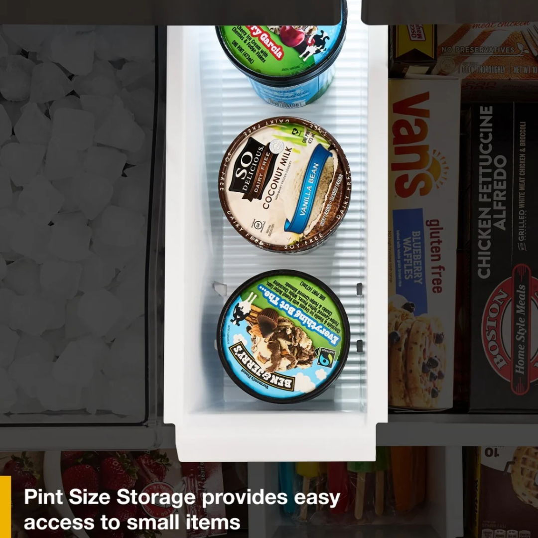 Pint Size Storage brinda fácil acceso a refrigerios congelados y helado de tamaño pinta, para que no queden enterrados en el congelador.