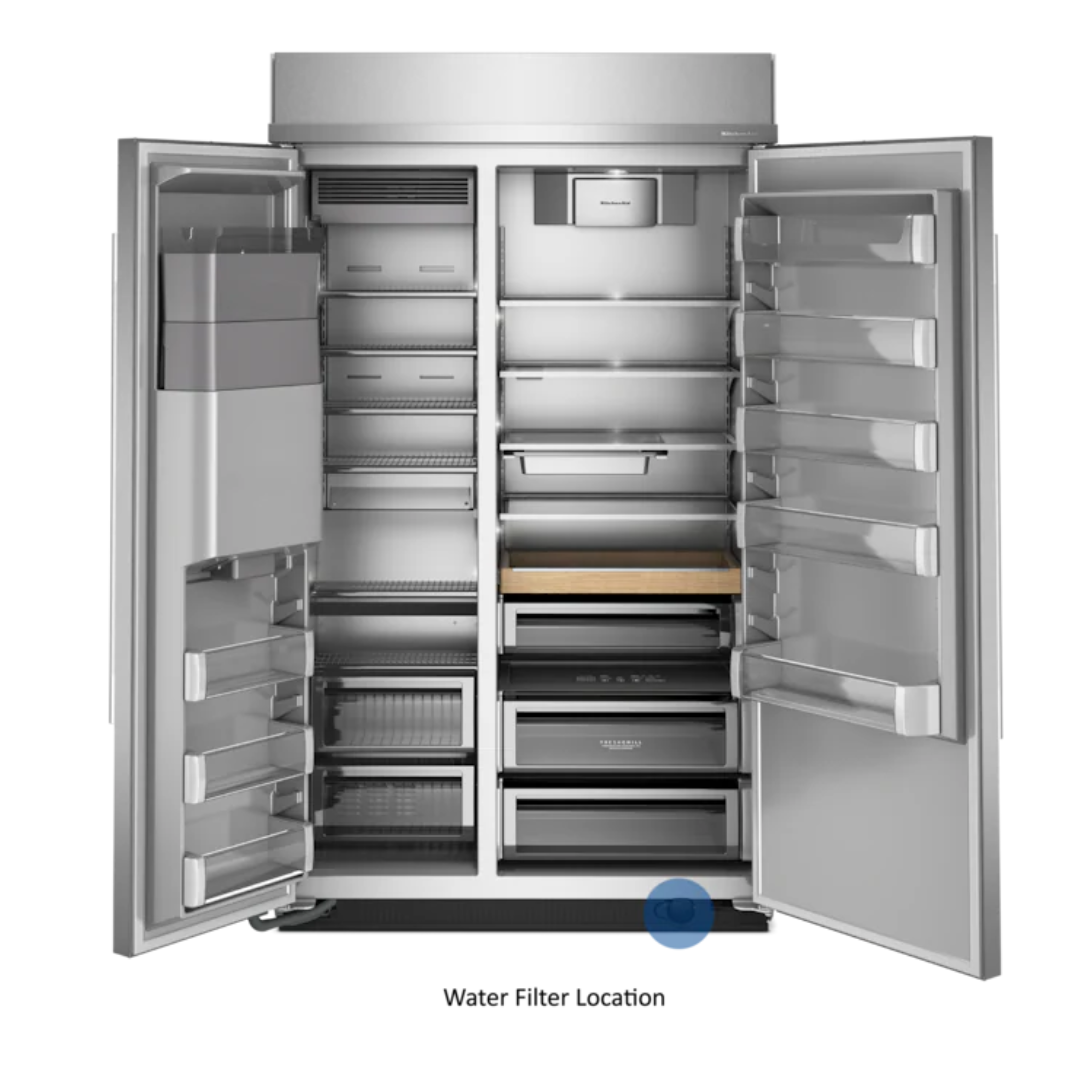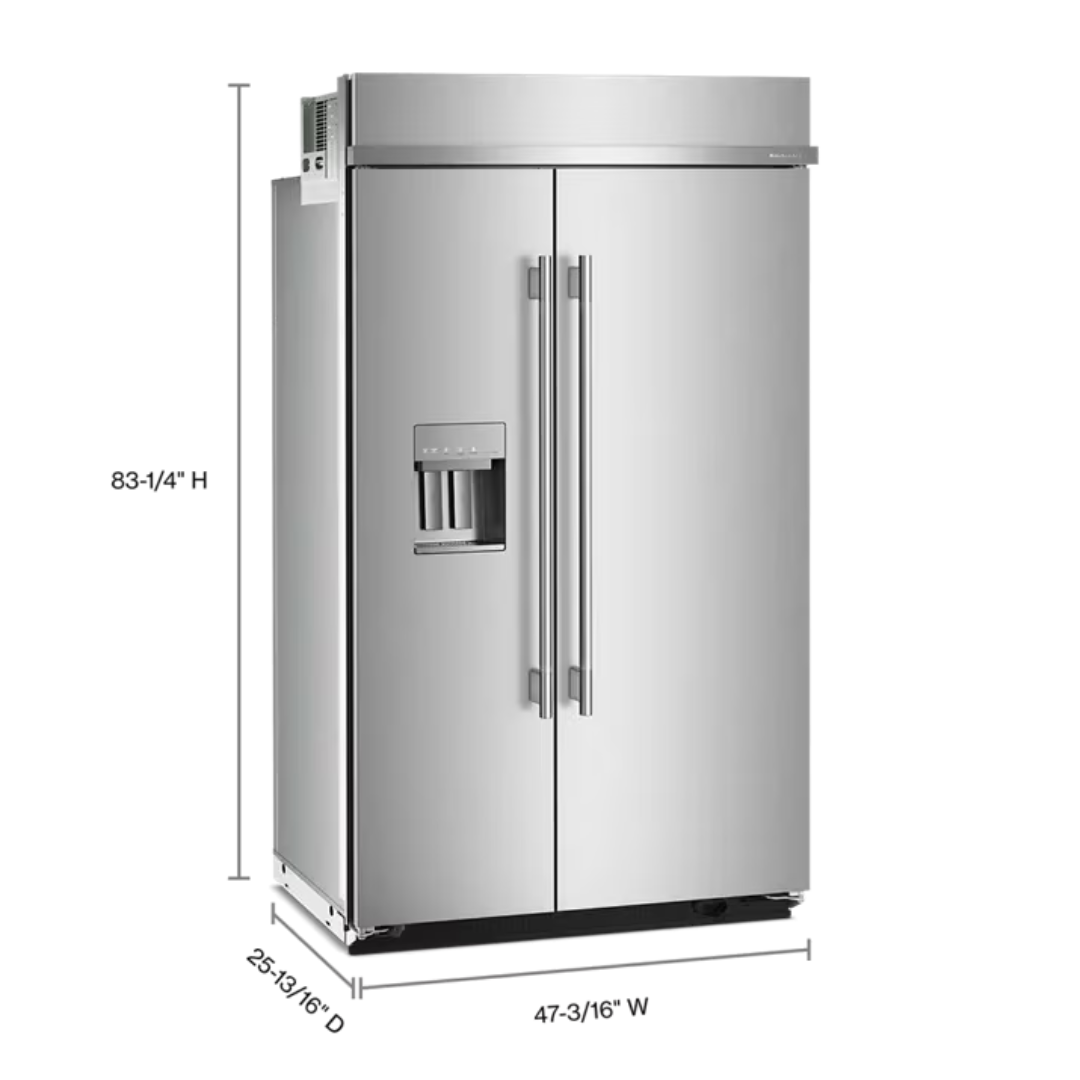 Refrigerador empotrado de dos puertas de 29.4 pies cúbicos y 48 pulgadas con dispensador exterior de agua y hielo con llenado medido.