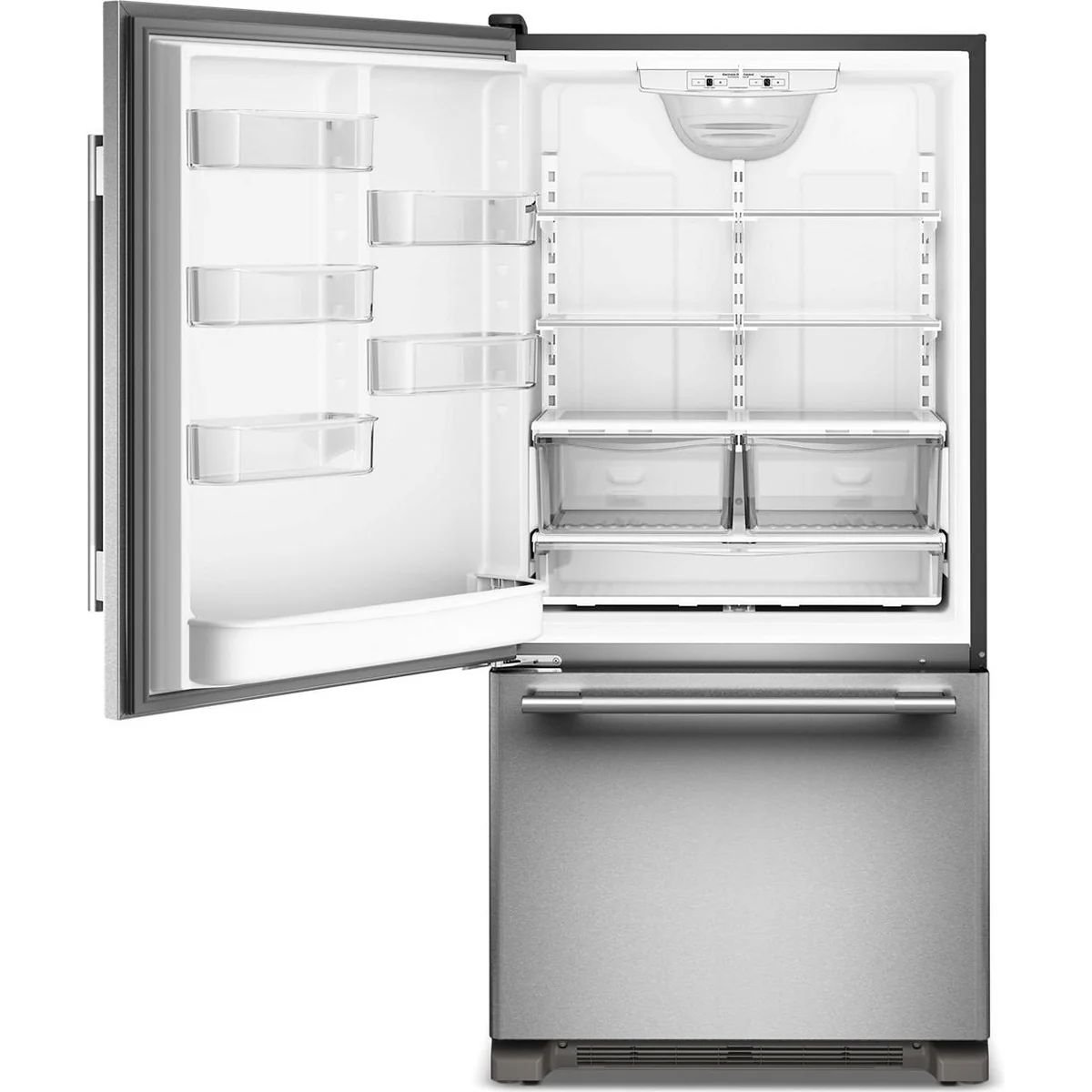 Refrigerador independiente de 33 pulgadas con montaje inferior y capacidad total de 22.07 pies cúbicos, sistema de enfriamiento Preserva®, iluminación LED ultrabrillante, estantes con marco antiderrames, compartimentos para verduras, acabado PrintShield®